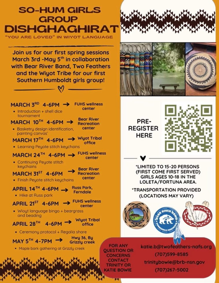 Some of the other activities the girls will be learning about this spring include: Basketry design identification, Wiyot language Bingo, Learning to bead Peyote stitch keychains, hiking in Wiyot ancestral territory, Ceremonial protocols & finishing up with a gathering trip for maple bark. Please see our flyer below for more information or reach out if you have any questions.