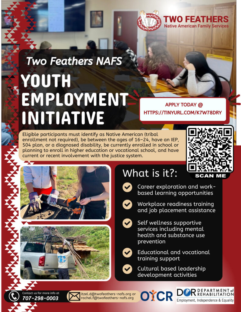 Two Feathers Native American Family Services is excited to share an opportunity for Native youth through the Youth Employment Initiative (YEI), a statewide workforce development program designed to support young people in building meaningful pathways to employment. This program serves Native youth ages 16–24 who may be navigating disabilities and/or justice system involvement, offering tools, resources, and individualized support to help them successfully transition into the workforce.